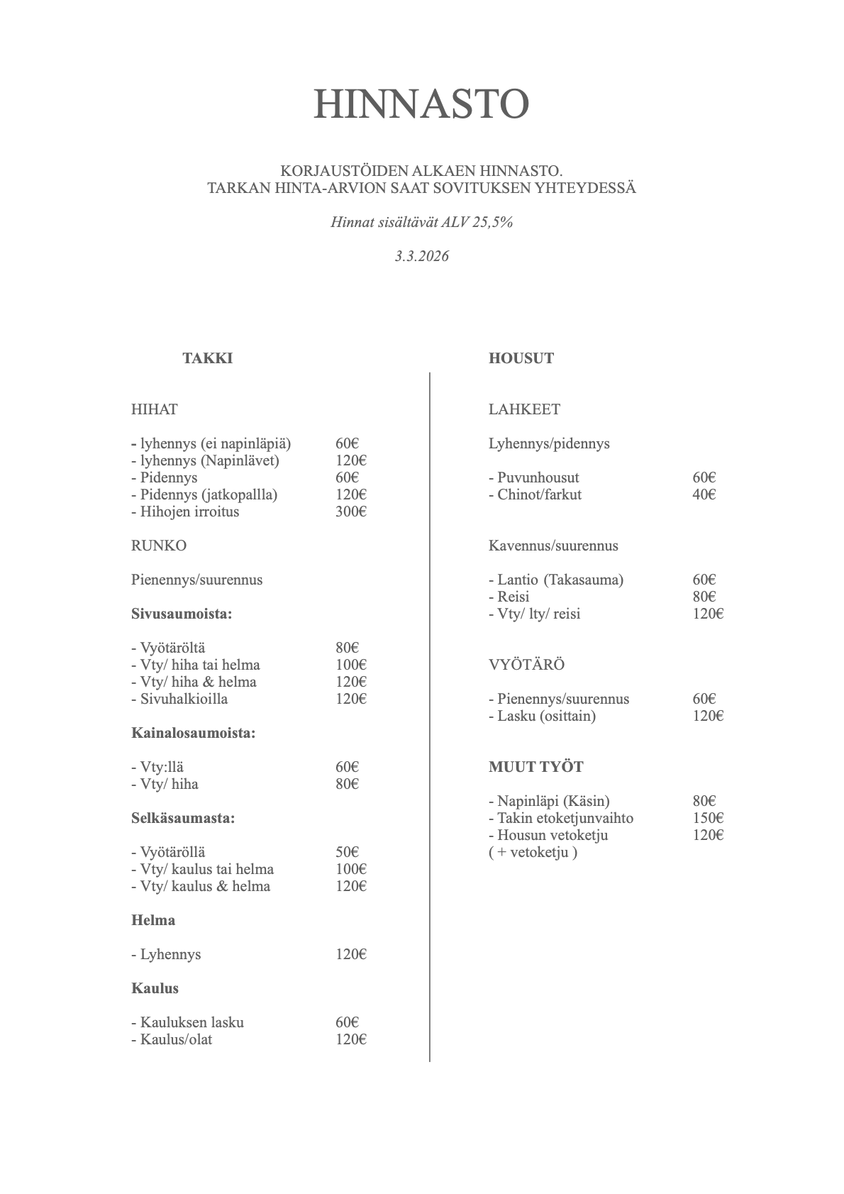Korjaus ja muutostyöt on laaja alue farkkujen lyhentämisen ja isältä pojalle frakin muokkaamisen välillä. Kannattaa aina kääntyä räätälin puoleen jos puku kaipaa korjausta, muokkaamista, tai muuta huoltoa. Huonosti istuva puku saadaan istuvaksi kenties helposti ja edullisesti. Korjaus ja muutostöiden sovittaminen ja kustannusarvion laskeminen on aina ilmaista.